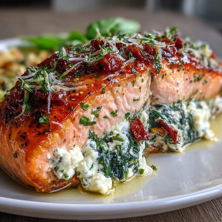 Pin It There's something about the sound of salmon sizzling in the oven that makes a Tuesday night feel almost special. I discovered this stuffed salmon recipe on an ordinary afternoon when I was staring at four fillets in the fridge and a container of spinach that needed using up, thinking I could either make something forgettable or actually try. The moment I tasted that first bite, the way the creamy feta and roasted peppers stayed tucked inside the flaky fish, I understood why this became my go-to when I want to impress without spending hours in the kitchen.