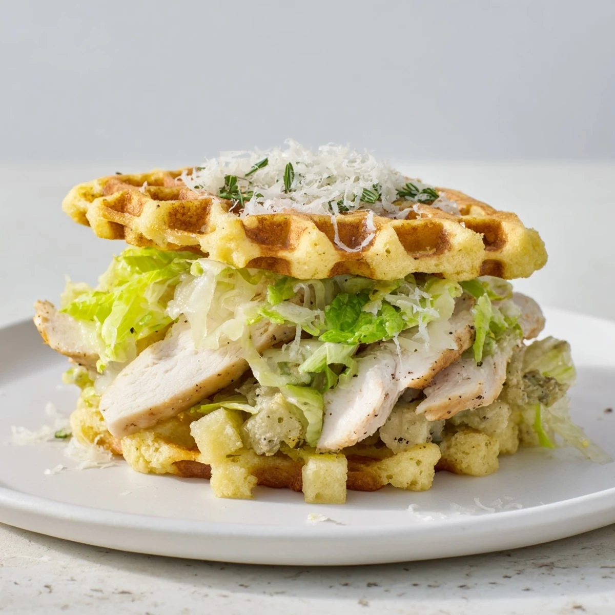 - Set a waffle down, pile on sliced chicken, a big scoop of dressed salad, and shaved Parmesan. Top with another waffle and finish with a grind of black pepper, then try not to eat it over the sink.