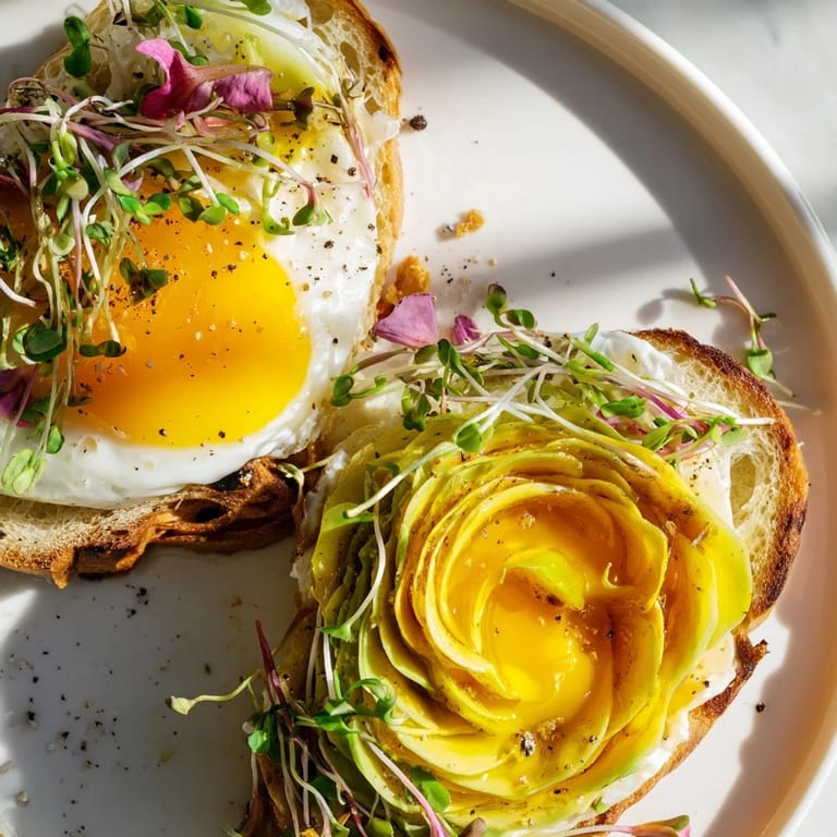 - Place each cloud egg on a slice of toast, top with an avocado rose, a drizzle of honey, and a generous handful of microgreens.