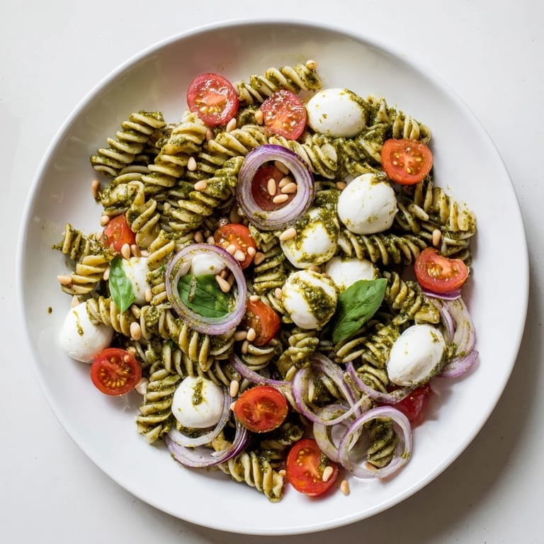 Pin It A vibrant, refreshing pasta salad featuring tender pasta, creamy mozzarella, juicy cherry tomatoes, and aromatic basil pesto—perfect for picnics or light lunches.
