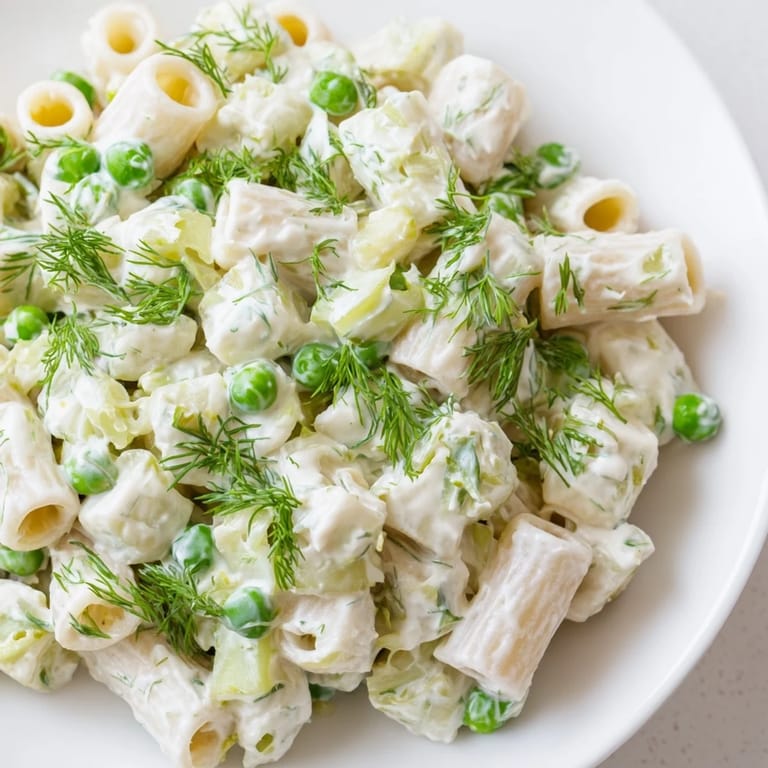 - Pour that creamy dressing over your pasta mixture and gently fold everything together until each piece is coated in that tangy, dilly goodness.