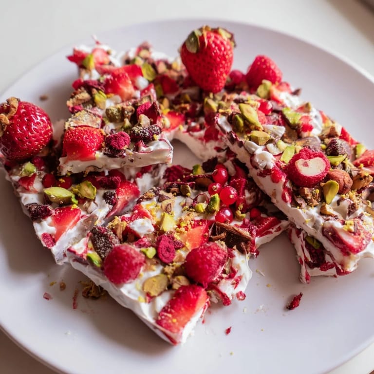 Pin It A refreshing, tangy-sweet frozen treat featuring creamy yogurt topped with vibrant red berries and a hint of crunch—perfect for a healthy snack or light dessert.
