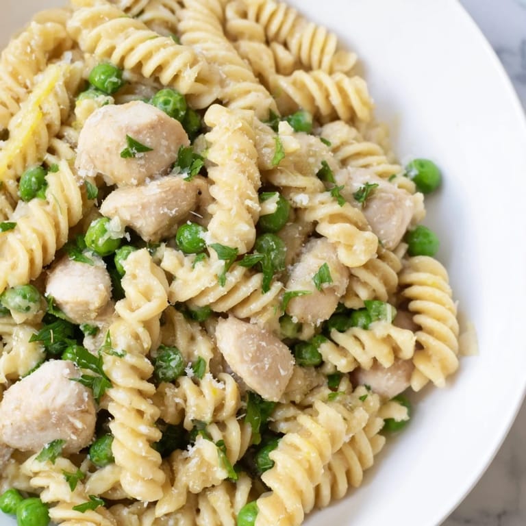 - Add peas and return chicken to the skillet. Toss in cooked pasta, Parmesan, lemon zest, and juice. Add reserved pasta water a little at a time until the sauce lightly coats every curl.