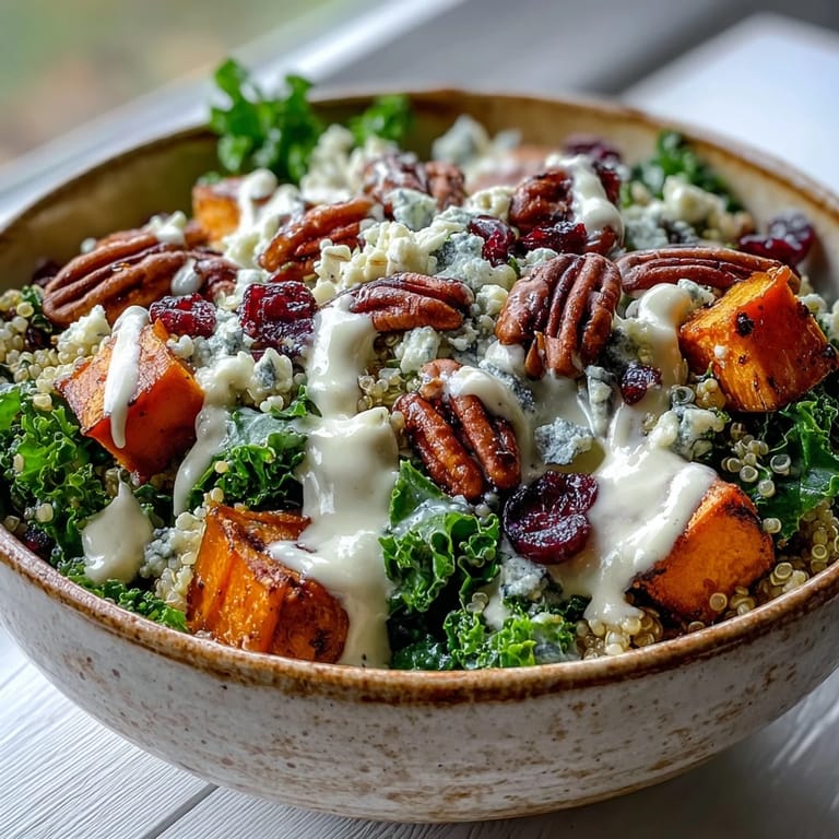 - Divide the quinoa among four bowls, then arrange the kale, roasted sweet potatoes, pecans, cranberries, and blue cheese on top in a way that looks intentional. Drizzle the dressing over everything just before serving so nothing gets soggy.