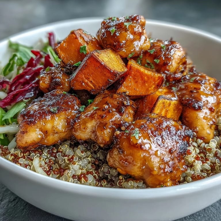Every element of this bowl serves a purpose beyond just looking pretty on a plate. The sweet potatoes bring natural sweetness that pairs with the hot honey dressing, the quinoa is the protein-packed base that makes you feel full, the slaw adds crunch and brightness so your mouth doesn't get bored, and the chicken ties it all together with smokiness and substance. When you eat it all together, you're not just getting different textures and flavors—you're getting a meal that feels complete.