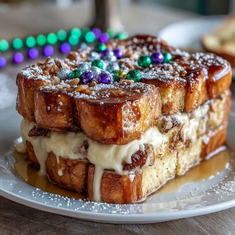 Pin It My sister called me the night before Mardi Gras, frantic about feeding a houseful of people at dawn. She wanted something that felt like celebration but wouldn't tie her to the stove while everyone arrived. I thought of King Cake—that gaudy, delicious symbol of the season—and realized it could become breakfast. What started as a desperate phone call became this overnight casserole, a dish that does all the work while you sleep and wakes up golden and festive.