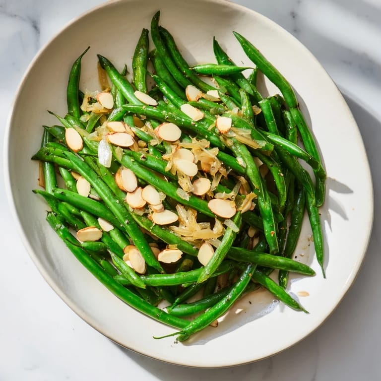 Pin It A vibrant, crisp side dish featuring tender green beans, fragrant garlic, and toasted almonds for a perfect blend of flavor and crunch.
