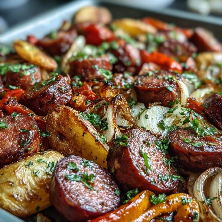 Pin It There's something magical about the moment you pull a sheet pan from the oven and the kitchen fills with that smoky, charred aroma—it happened to me on a particularly hectic Tuesday when I needed dinner ready in under an hour and wanted something that felt indulgent without the fuss. I'd grabbed smoked sausage on a whim, some bell peppers that were begging to be used, and a few other vegetables scattered across my counter, then tossed them all together with olive oil and smoked paprika. What emerged was this gloriously caramelized medley that somehow felt both comforting and exciting, and I realized I'd stumbled onto something I'd be making constantly.