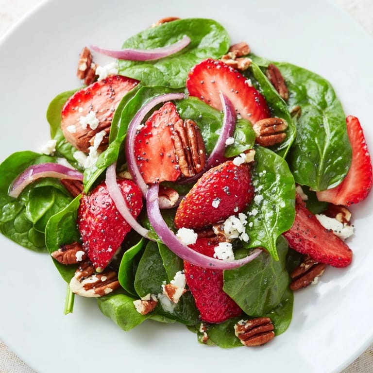 Pin It There's something about the first warm day of spring that makes me crave this salad. I stumbled onto the combination while experimenting in my kitchen one afternoon, tossing together whatever looked fresh at the farmer's market—spinach that practically glowed green, strawberries so ripe they smelled like summer, and a handful of pecans I'd been saving. The moment I drizzled that poppy seed dressing over everything, I knew I'd found something special.